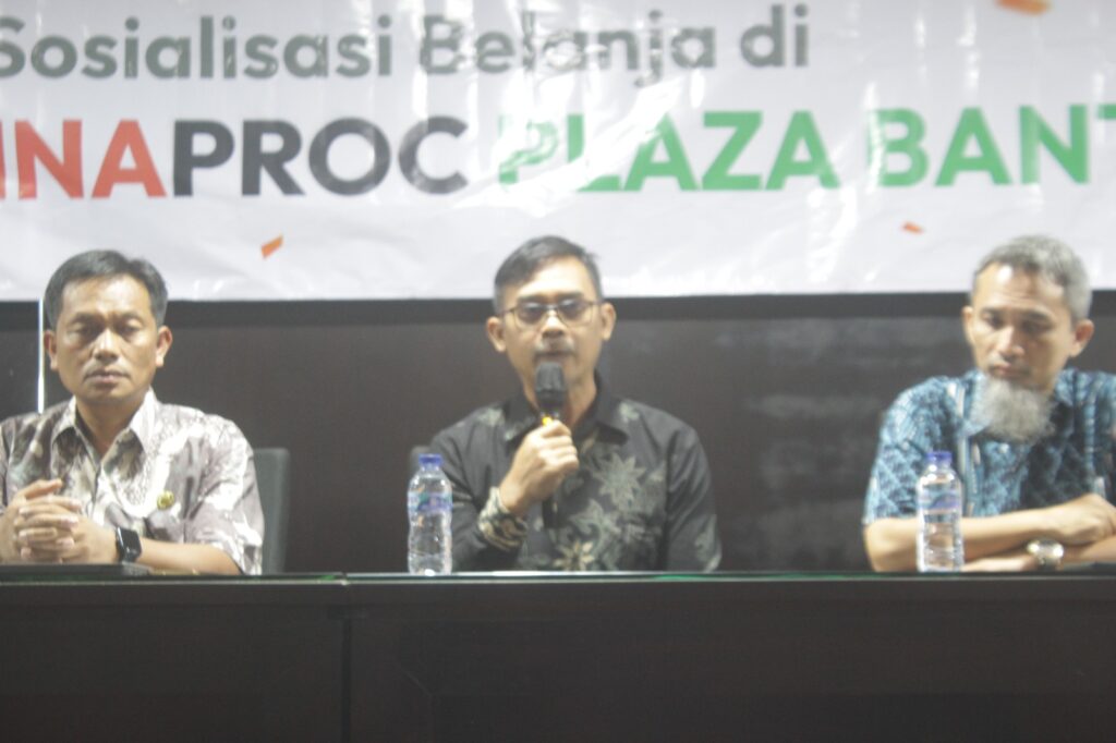 Endang Saputra , Kepala Divisi Riset, Teknologi, dan Informasi PT ABM (tengah) sedang bersosialisasi Plaza Banten melalui INAPROC didepan para OPD Provinsi Banten.