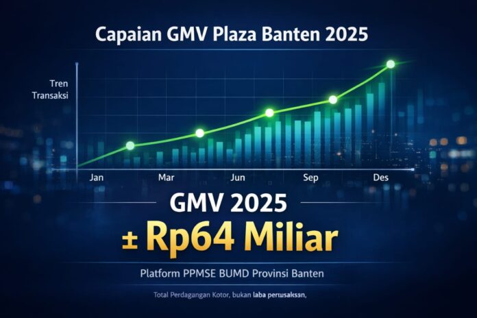 Serang, Banten – Kinerja transaksi Plaza Banten sepanjang tahun 2025 mencatat capaian positif. Dari target Gross Merchandise Value (GMV) sebesar Rp55 miliar, realisasi transaksi berhasil melampaui target dan mencapai sekitar Rp64 miliar, menandai penguatan ekosistem perdagangan digital daerah serta meningkatnya kepercayaan pelaku UMKM dan mitra terhadap platform Perdagangan Melalui Sistem Elektronik (PPMSE) milik daerah.